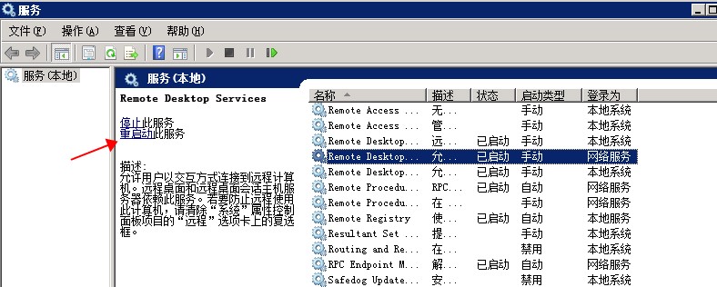 左下角点击开始 -> 找到”服务“ -> 找到 ”Remote Desktop Services" 点击重启此服务